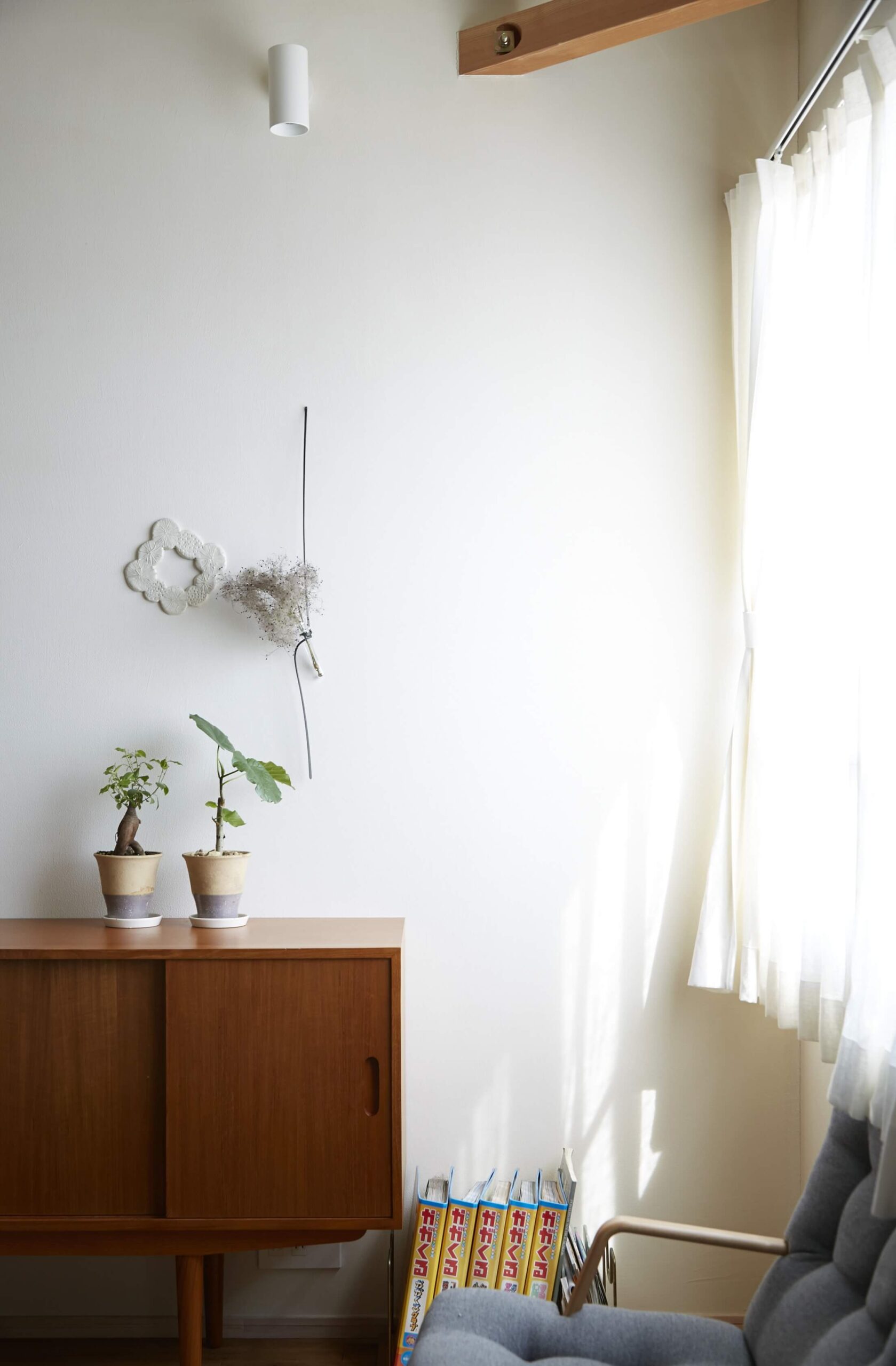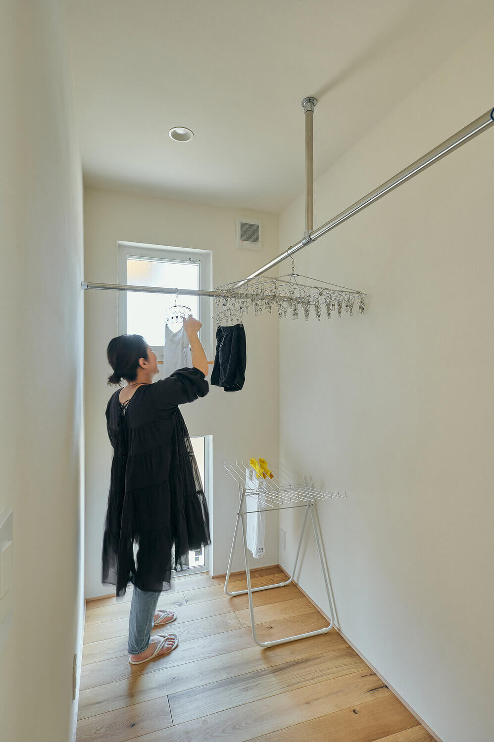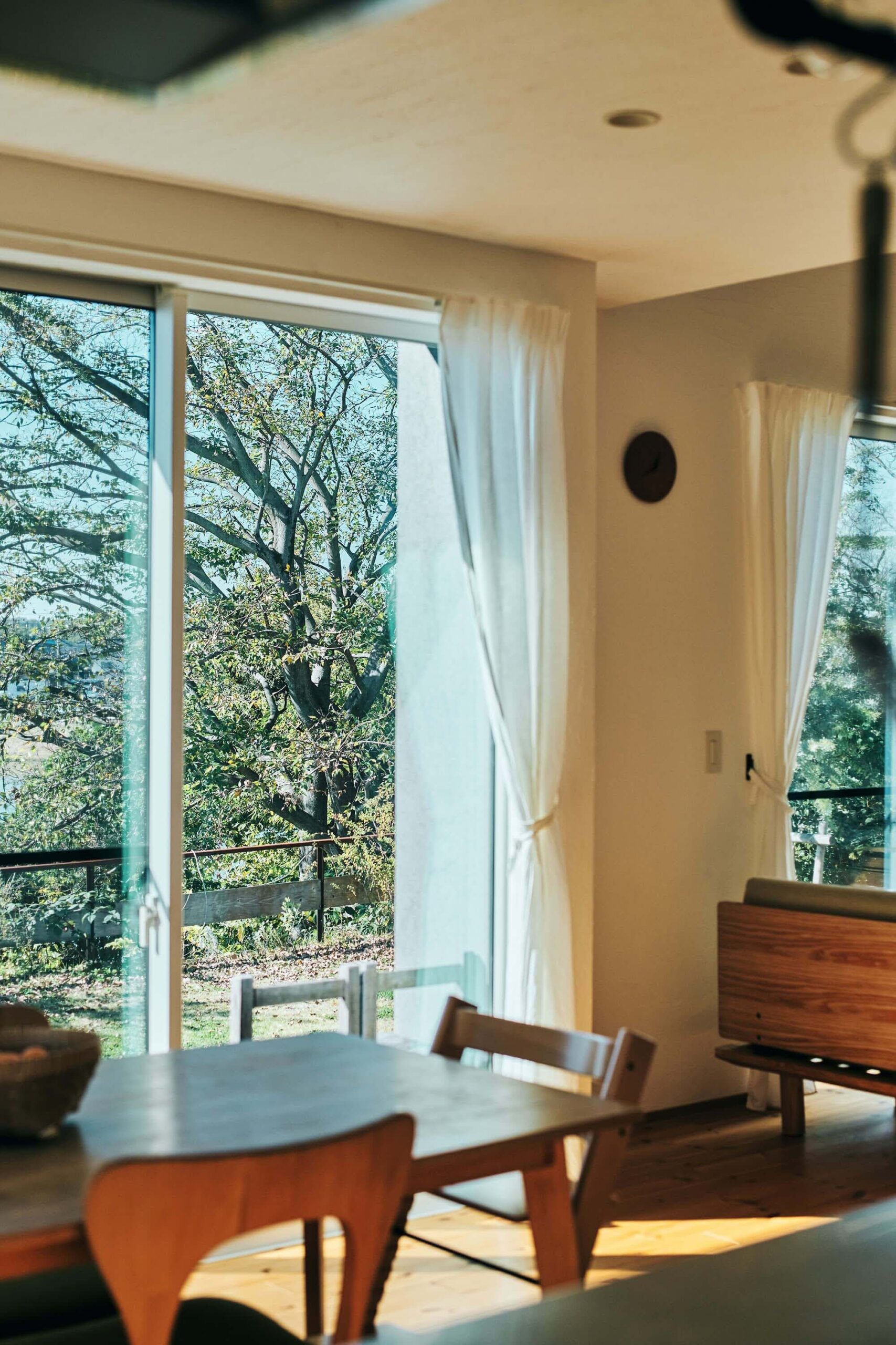 1つ目は、自然素材でつくられた室内は調湿性に優れています。フローリングや壁板など木は湿気を吸ってくれます。漆喰や珪藻土も同じです。だから自然素材の家は梅雨時期のジメジメとした空気を内装材が吸ってくれるので心地よい空気感となります。冬は乾き気味になるので加湿器をして丁度いいと思います。室内の湿度が低いので洗濯物がよく乾きます。