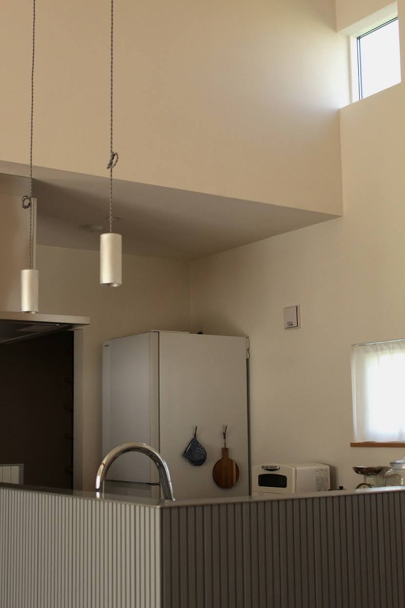 24帖あるLDKは、勾配天井とし、壁、天井ともに漆喰が広がる大空間。大きな掃出し窓や、天井付近にある小窓から光が入り、家族で過ごす明るい団欒の場となります。キッチン続きのカウンターには地窓があり、足元の植栽を眺めることができます。
