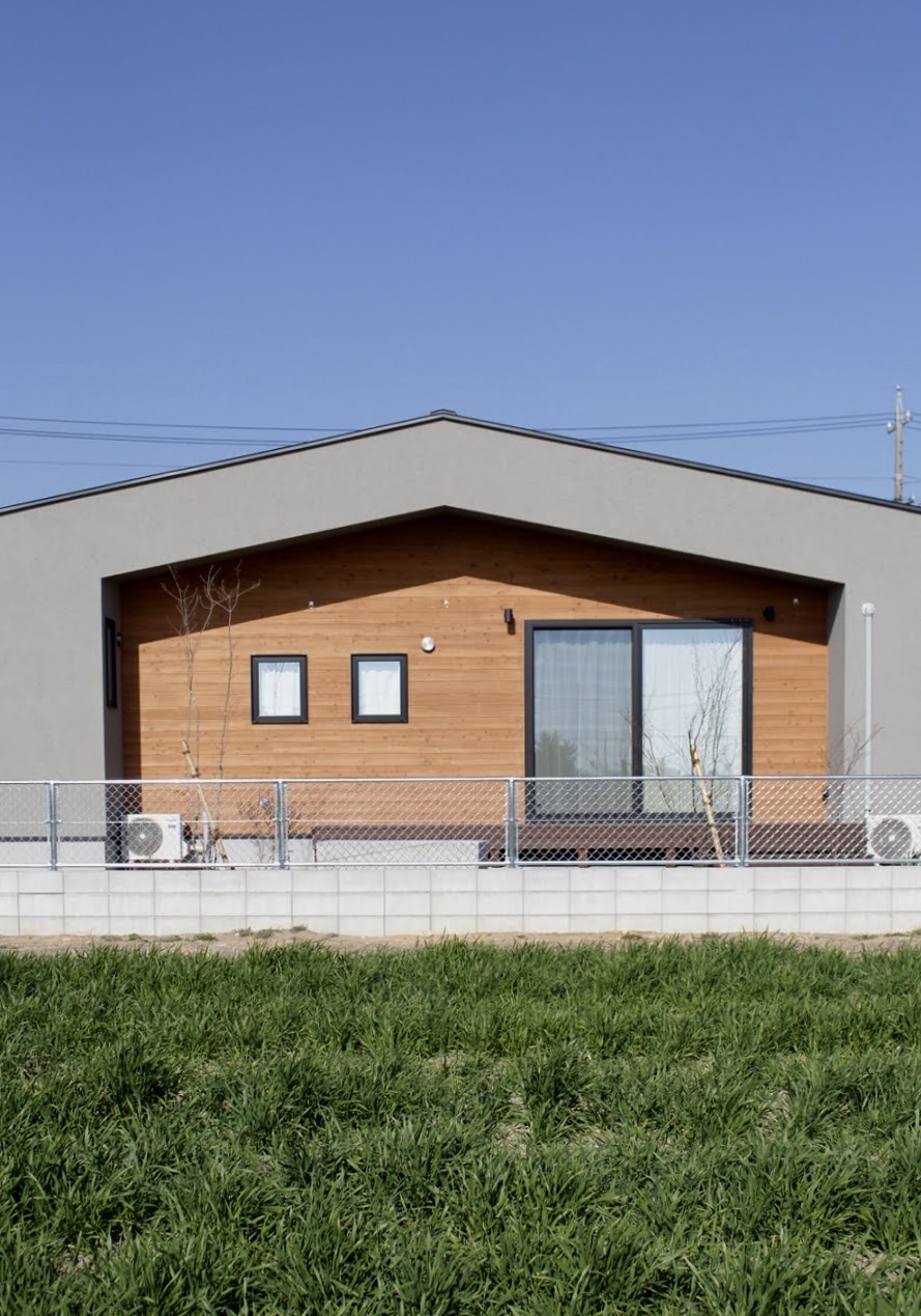 周りを見渡すと、畑が広がる刈谷の土地に建つ平屋。その地域に馴染むよう高さを押え、メインファサードは特徴的なシンメトリーとなっています。