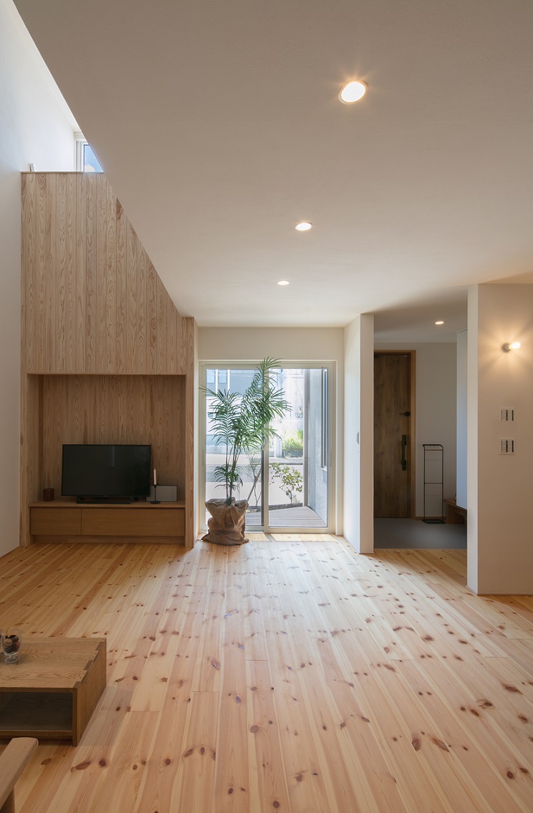 リビングにやさしい光が広がる、吹き抜けのある住まいが名古屋市の上志段味に建ちました。壁と一体になったテレビボードには、無垢の杉板を使い、2階まで続く上質な吹き抜け空間を感じられます。