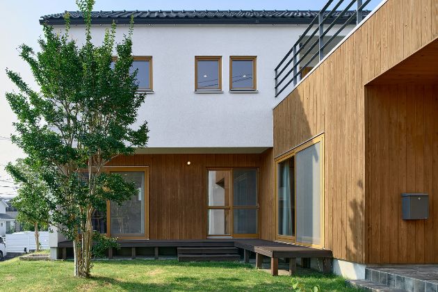 外壁には透湿モルタルと板張りを組み合わせ、外観に温もりと重厚感を。